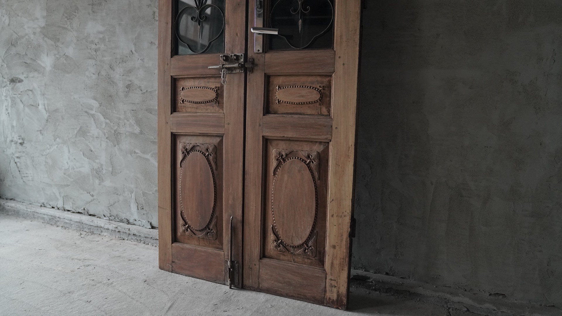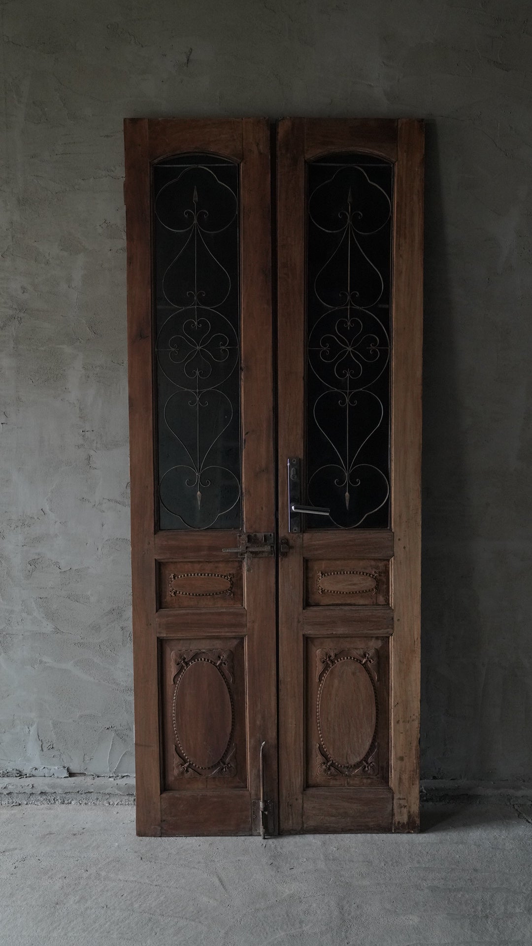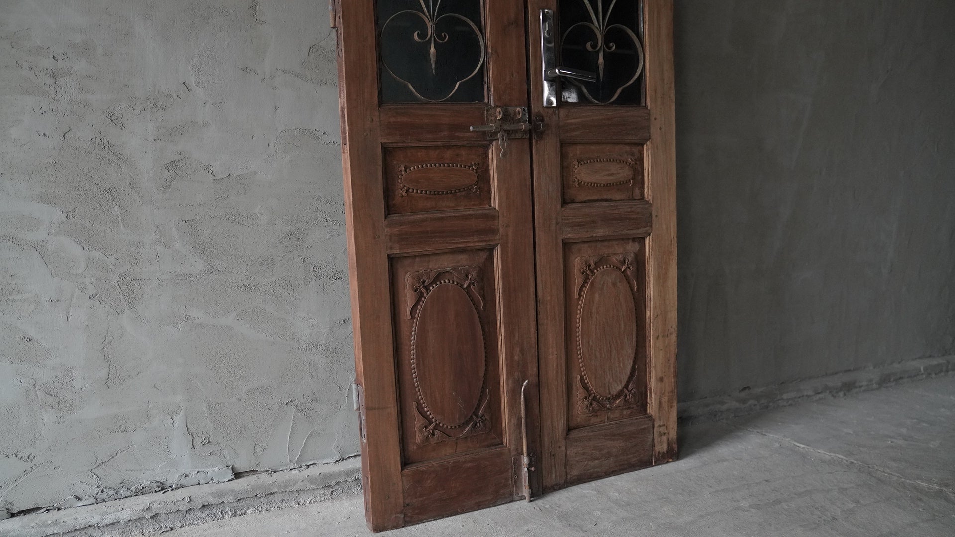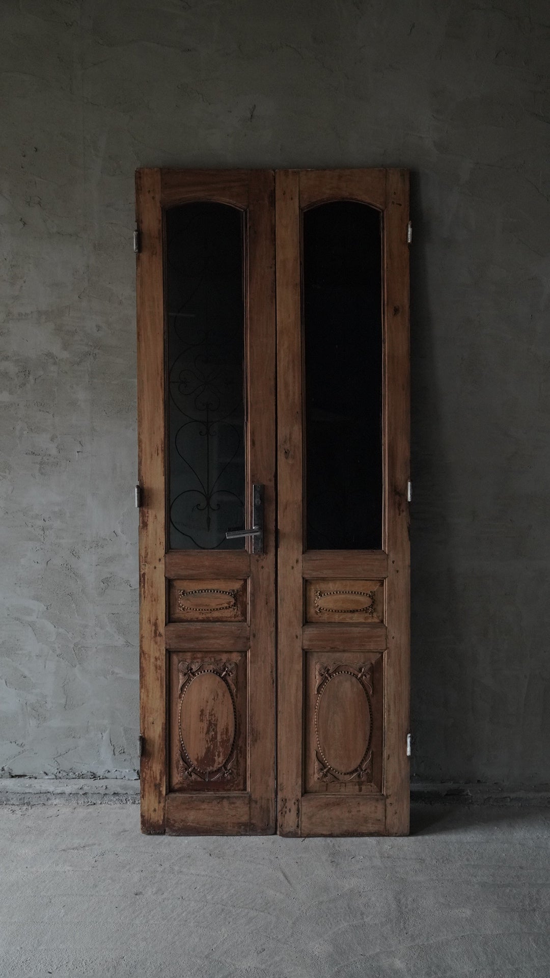ベトナムのハノイで使用されていた両開きの木製ドアです。上部には黒いカラーガラスと繊細なアイアンワークが組み合わされ、落ち着いた雰囲気を持っています。下部には楕円形を基調とした彫刻装飾が施され、全体にクラシックな印象を与えます。店舗の入り口や室内パーテーション、インテリアのアクセントとしても活用できる一品です。