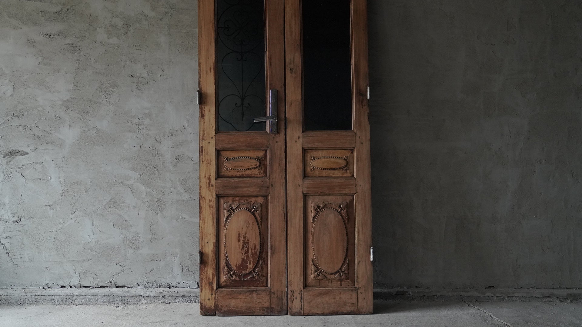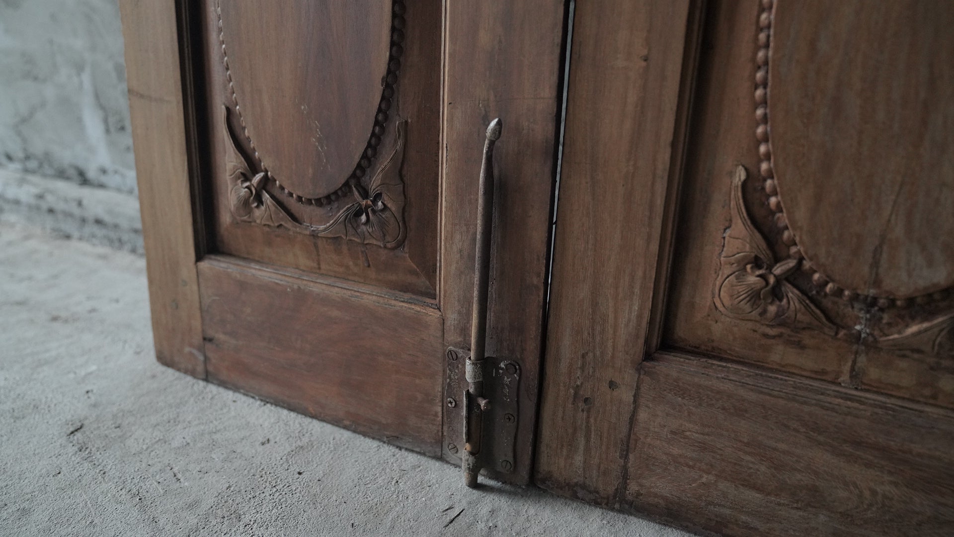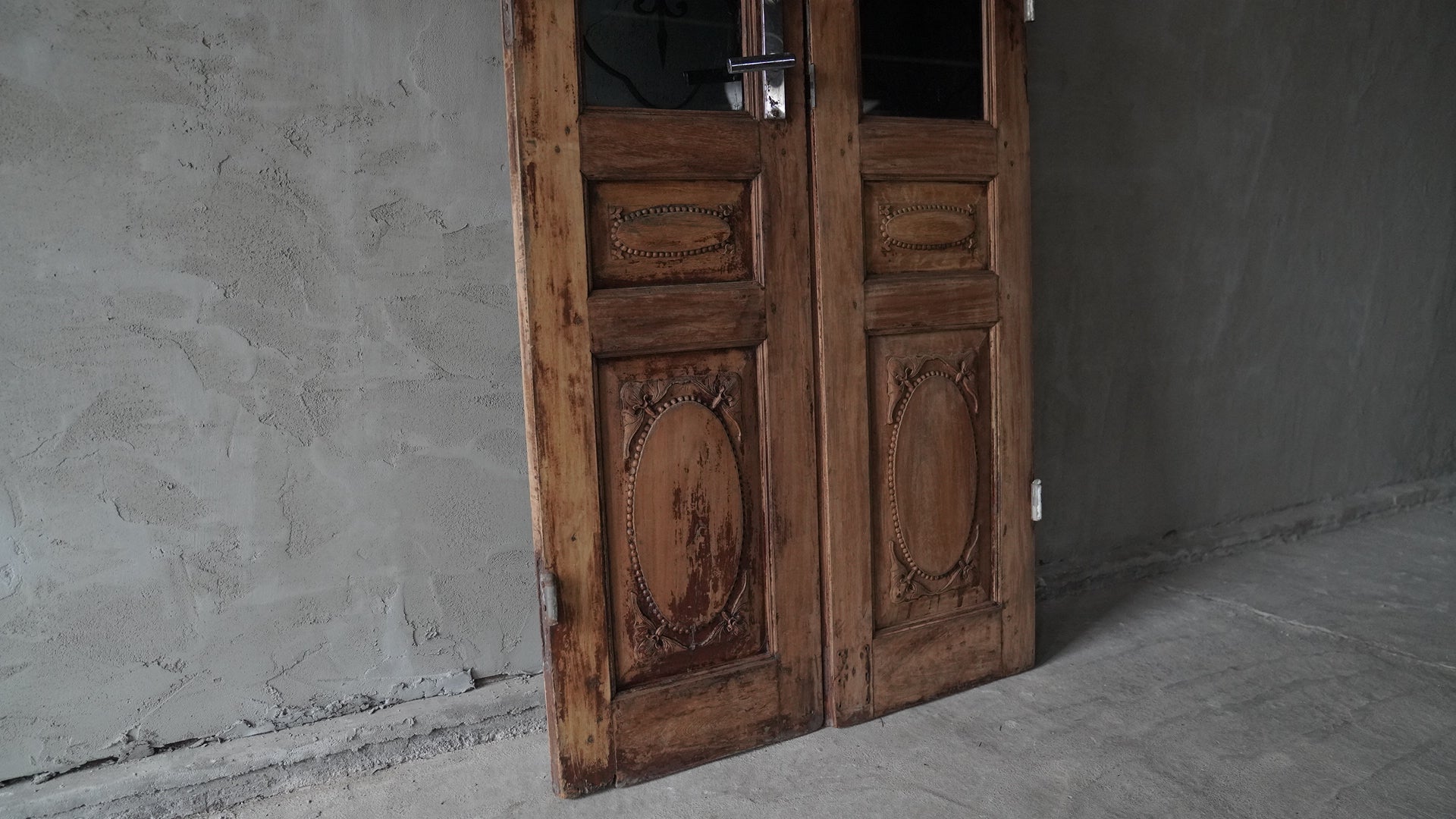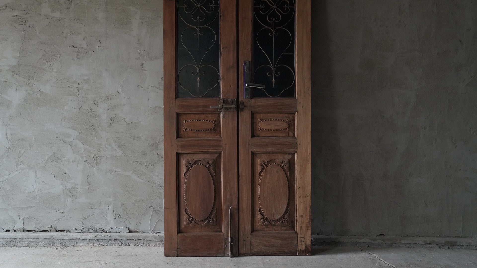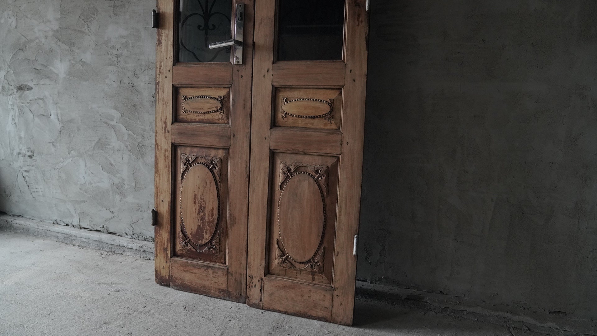 ベトナムのハノイで使用されていた両開きの木製ドアです。上部には黒いカラーガラスと繊細なアイアンワークが組み合わされ、落ち着いた雰囲気を持っています。下部には楕円形を基調とした彫刻装飾が施され、全体にクラシックな印象を与えます。店舗の入り口や室内パーテーション、インテリアのアクセントとしても活用できる一品です。