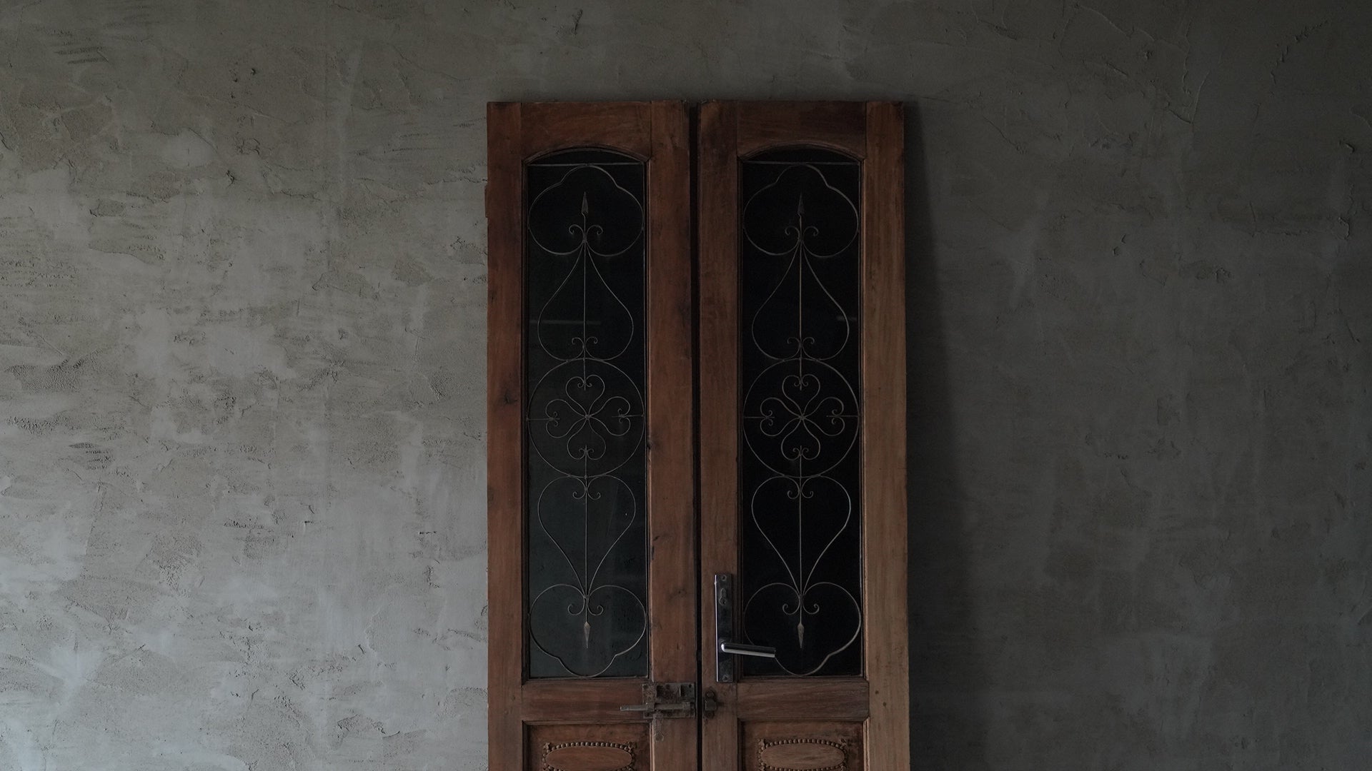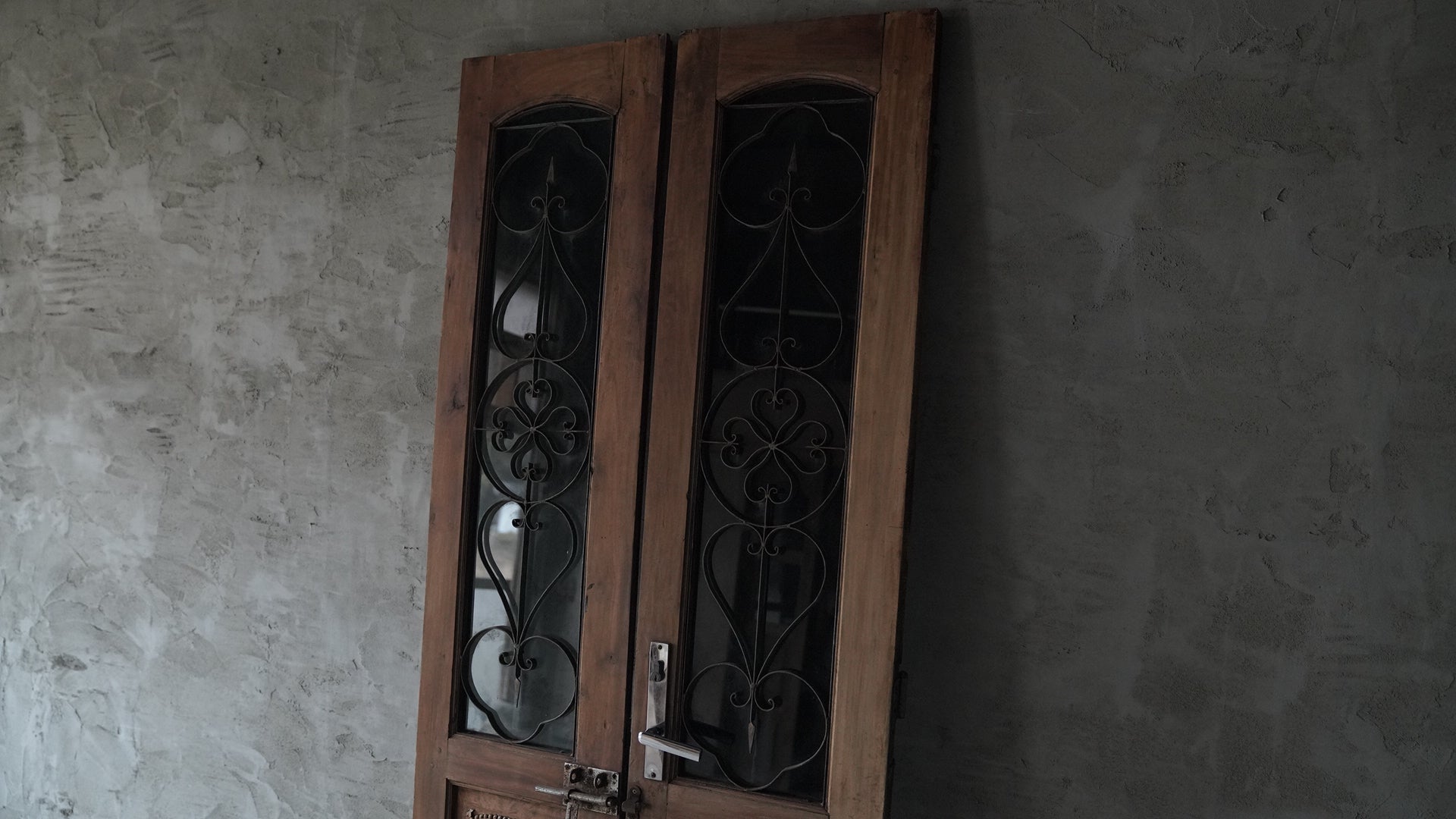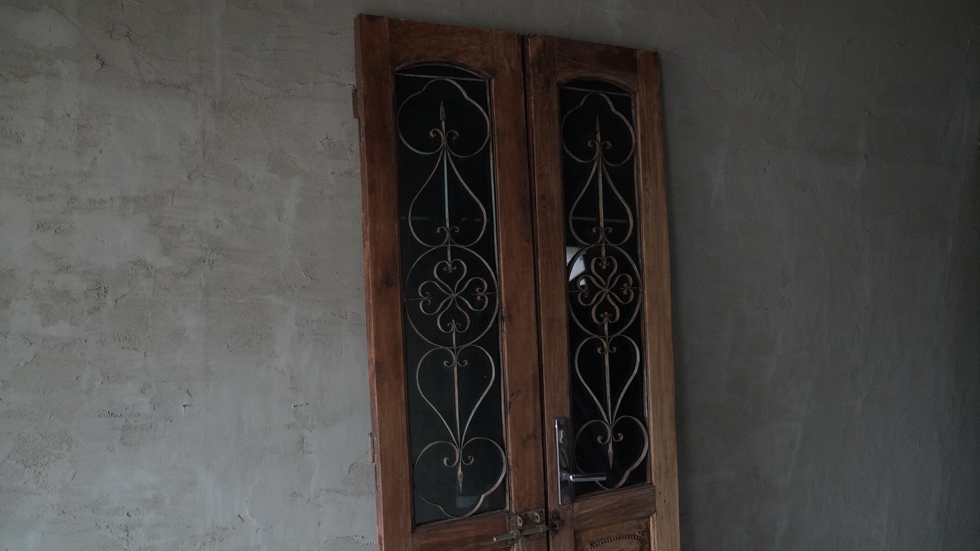 This double-opening wooden door from Hanoi, Vietnam features upper panels combining black-tinted glass with delicate ironwork, creating a refined, understated look.