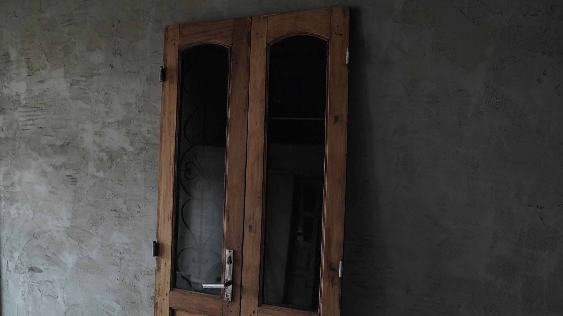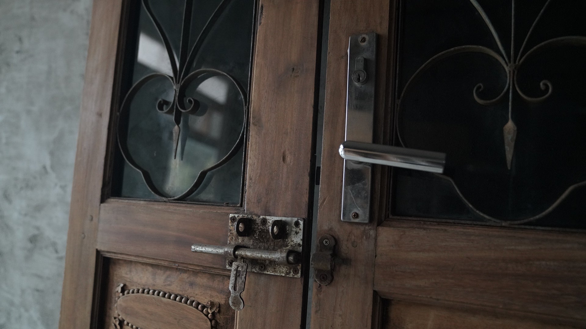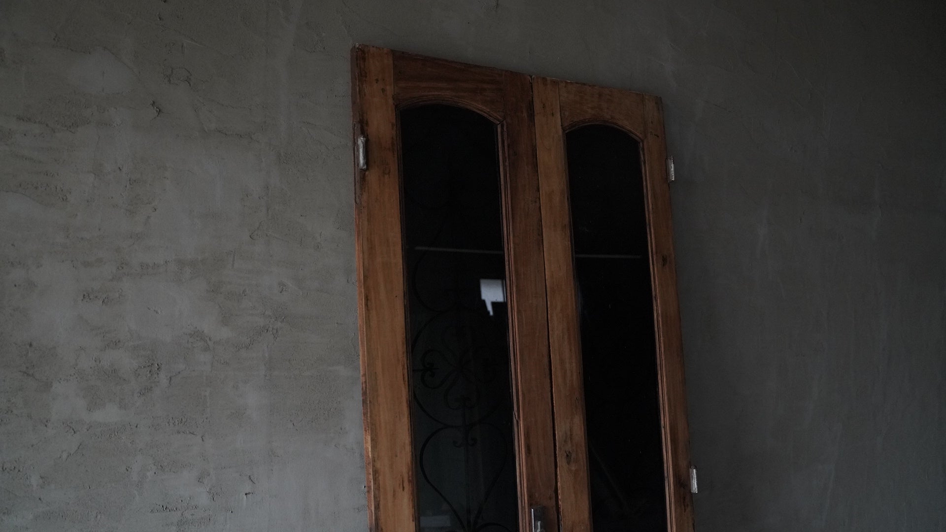 This double-opening wooden door from Hanoi, Vietnam features upper panels combining black-tinted glass with delicate ironwork, creating a refined, understated look.